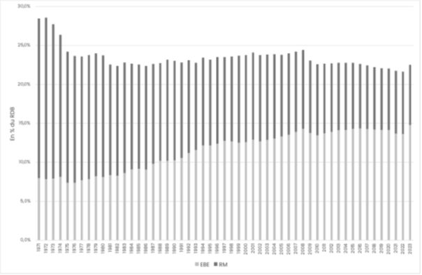 Figure 5. Évolutions de l’EBE et des revenus mixtes des ménages de 1971 à 2023 (en % du revenu disponible brut)