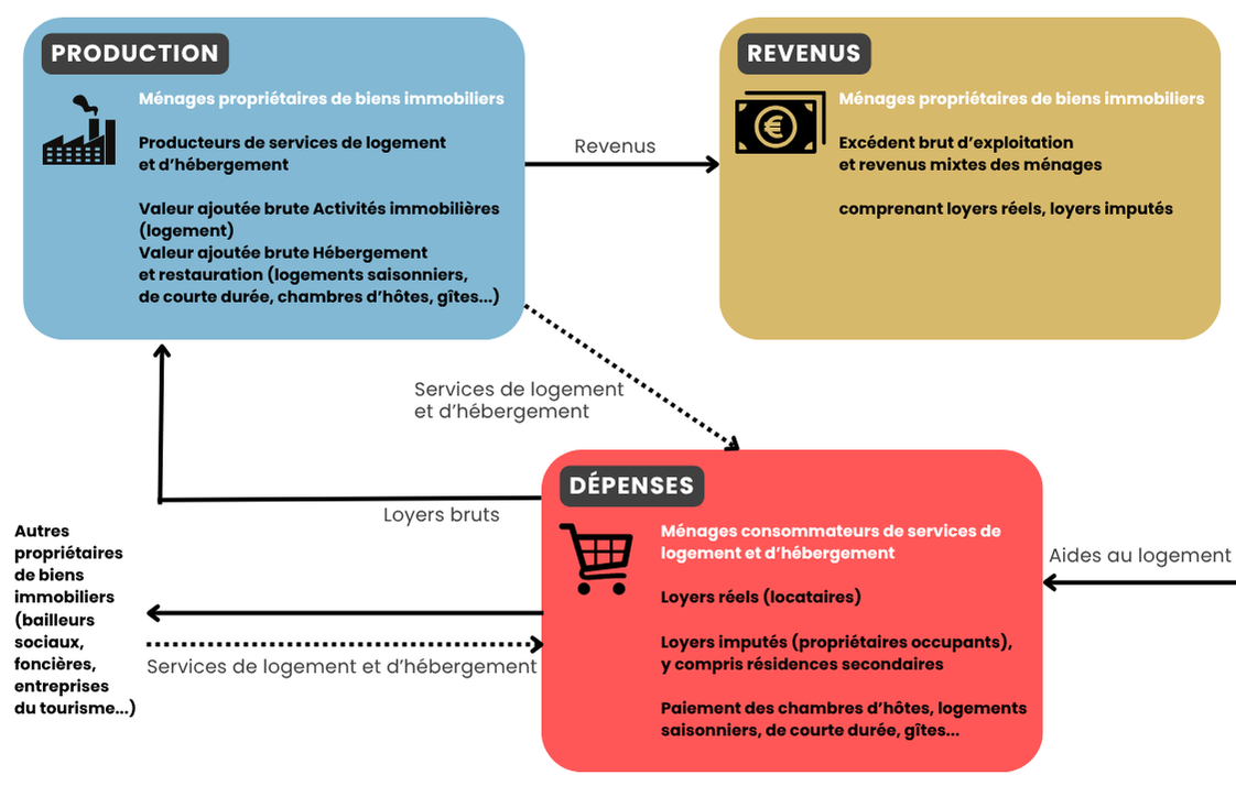 Ce traitement particulier des loyers dans les comptes nationaux conditionne la façon dont ils apparaissent dans la production, les revenus, et la dépense des ménages.