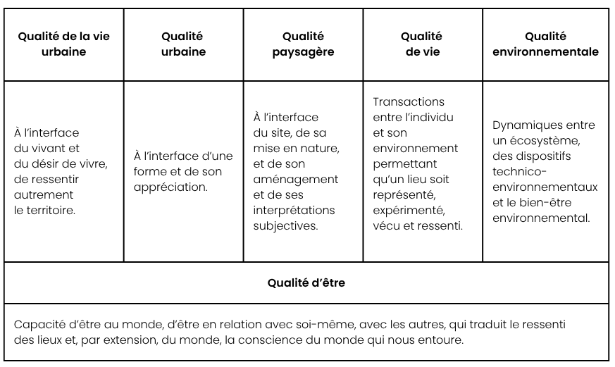 La qualité urbaine se décline en plusieurs dimensions qui irriguent les lieux : la qualité de la vie urbaine, la qualité urbaine, la qualité paysagère, la qualité de vie, la qualité environnementale et la qualité d’être (voir tableau 1 ci-dessous).