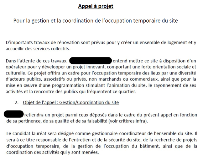 Figure 2. Appel à projet du propriétaire pour la gestion du Vieux Cloître
